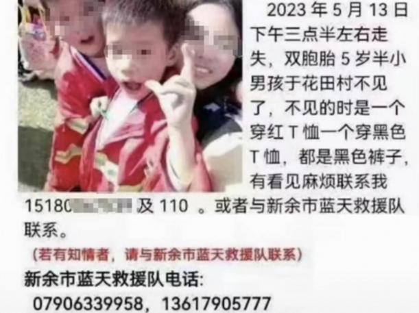 失蹤雙胞胎平時是和父母住在新余市區,在周末的時候才會回到田園村的爺爺奶奶家,在5月13日下午3:30左右,雙胞胎兄弟和他們的堂弟哥哥一起在爺爺奶奶家玩躲貓貓,在玩的過程中,雙胞胎跑出了房子,當堂弟和哥哥從屋里出來找他們時沒有找到他們。