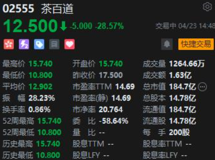 4月23日茶百道正式登陸港交所成為第二家新茶飲上市公司,即便有這種背景加持,茶百道也難擋破發之勢,發行市值超200億港元,但是開盤之后就遭遇滑鐵盧,跌幅超過了30%,面對這一幕不由得讓人感到唏噓。