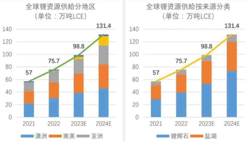 1.鋰電產業所需要的鋰資源,主要是來源于鋰礦或者是鹽湖,我國國內的鋰礦資源很少,但是鹽湖卻非常多,從鋰資源的供應鏈來看,去年全世界供應了99萬噸lce,整體增長量與往期相比達到了31%,今年預計還會再增長33%。