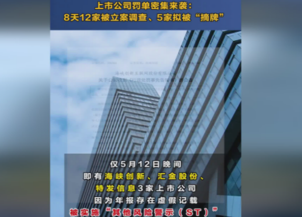 5月14日消息,根據(jù)wind統(tǒng)計(jì)數(shù)據(jù)顯示,最近八天內(nèi)至少有12家上市公司被立案調(diào)查,被監(jiān)管點(diǎn)名的企業(yè)總數(shù)量已經(jīng)達(dá)到20多家,這些上市公司被立案調(diào)查的同時(shí),多個(gè)證券機(jī)構(gòu)和中介也頻頻收到罰單,僅5月10日當(dāng)天,就有六家券商被證監(jiān)局出具了罰款。
