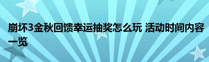 在崩壞3里,金秋回饋幸運抽獎活動是限定的抽獎活動,有超級豪華獎勵可以被艦長抽取到哦!下面就為大家帶來詳細的攻略介紹,感興趣的玩家不要錯過哦!