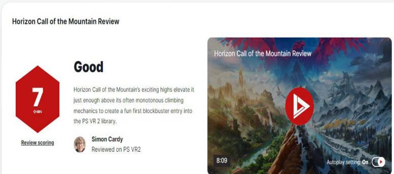 在此前的游戲體驗當中,IGN 為這款游戲打出了7分,評測人表示這款游戲的高度使得極為平常的攀登都變得有意思起來,是PSVR2的首個重頭戲游戲。