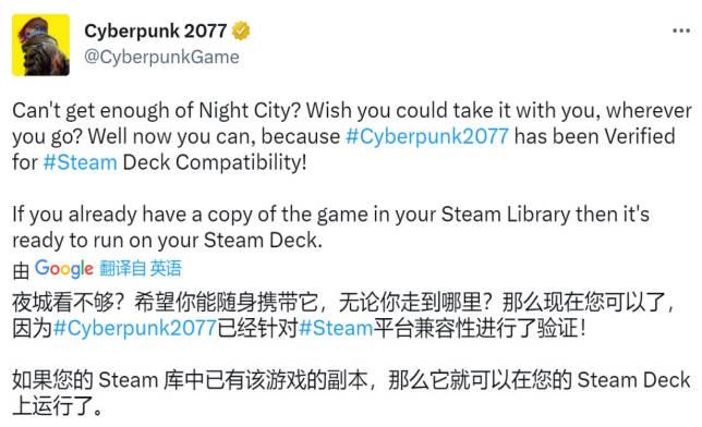 《賽博朋克2077》在官推宣布已經(jīng)通過setam deck的驗證,這意味著玩家以后能夠在任何地方暢玩這一款游戲。根據(jù)《賽博朋克2077》的官方推特消息,“夜城看不夠?希望你能隨身攜帶它,無論您走到哪里?那么現(xiàn)在您可以了,因為Cyberpunk2077已經(jīng)針對steam平臺兼容性做了驗證!”玩家現(xiàn)在能在任何場合游玩賽博朋克2077,該游戲是CDPR通過steam deck的第三款游戲,在這之前,通過驗證的兩款游戲分別是《巫師3:狂獵》以及《巫師之昆特牌:王權(quán)的隕落》,CDPR表示自己目前沒有計劃為自己的游戲提供額外的steam deck優(yōu)化。