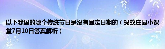大家好,綜合小編來為大家講解下。以下我國的哪個傳統節日是沒有固定日期的,螞蟻莊園小課堂7月10日答案解析很多人還不知道,現在讓我們一起來看看吧!