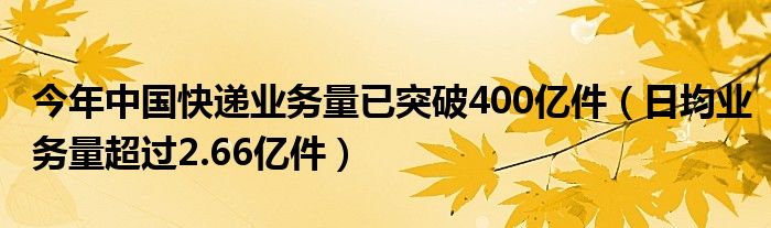 大家好,綜合小編來為大家講解下。今年中國快遞業務量已突破400億件,日均業務量超過2.66億件很多人還不知道,現在讓我們一起來看看吧!