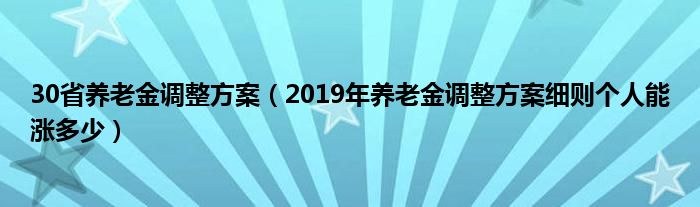 大家好,綜合小編來(lái)為大家講解下。30省養(yǎng)老金調(diào)整方案,2019年養(yǎng)老金調(diào)整方案細(xì)則個(gè)人能漲多少很多人還不知道,現(xiàn)在讓我們一起來(lái)看看吧!