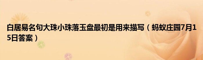 大家好,綜合小編來(lái)為大家講解下。白居易名句大珠小珠落玉盤(pán)最初是用來(lái)描寫(xiě),螞蟻莊園7月15日答案很多人還不知道,現(xiàn)在讓我們一起來(lái)看看吧!