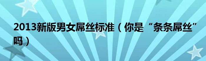 據微博話題顯示,1天之內就有超過113萬網友關注2013男女屌絲新標準。該標準分男女屌絲,男屌絲的10條衡量指標不僅包括飲酒類型、隨身攜帶現金數量、抽煙的品質、年終獎的多少,甚至還包括婚前交過女友的數量。