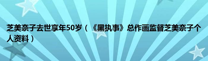 【芝美奈子去世享年50歲 《黑執事》總作畫監督芝美奈子個人資料】據日媒,《黑執事》總作畫監督芝美奈子因癌癥轉移于3月14日下午去世,享年50歲。