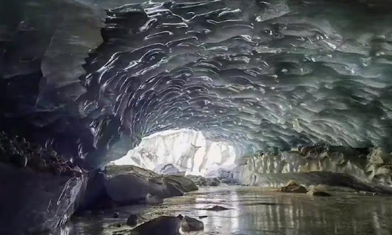 這個(gè)洞穴壁上全部都是冰,就像一個(gè)透明晶瑩的水晶宮殿。在陽光的照耀下,會(huì)展現(xiàn)出一些夢幻般的顏色,洞穴的兩端都都能夠正常進(jìn)入,中間的部分非常的黑暗,需要使用手電才能夠照明。