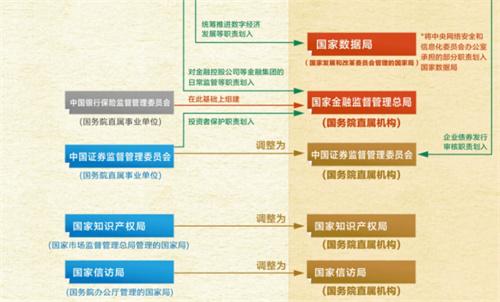 關于國務院機構改革方案的決定,經表決通過批準了找個方案,一些相關職責進行調整或者單位機構內劃入,中國證券監督管理委員會、國家知識產權局、國家信訪局調整為國務院直屬機構,不再保留中國銀行保險監督管理委員會,在此基礎上組建國家金融監督管理總局,是國務院直屬機構。此外,新組建國家數據局,統籌推進數字經濟的發展,將中央網絡安全和信息化委員會辦公室承擔的一部分職責劃入了國家數據局。