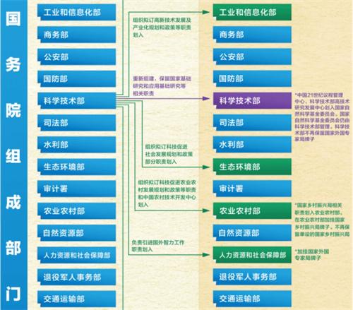 改革后,重新組建了科學技術部,將國家基礎研究、應用基礎研究等相關職責保留,同時將中國21世紀議程管理中心、科學技術部高技術研究發展中心劃入國家自然科學基金委員會,而國家自然科學基金委員會依舊由科學技術部管理,同時科學技術部將不再保留國家外國專家局牌子。