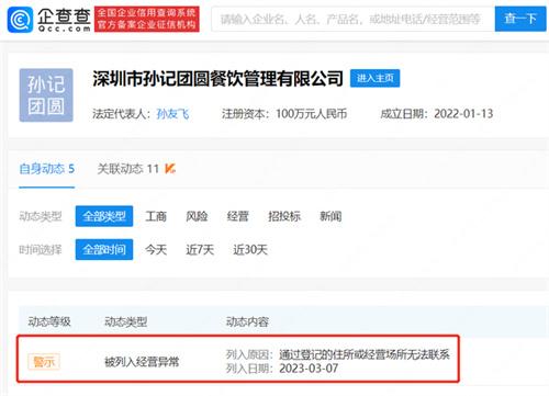 孫海洋夫婦所經營的深圳市孫記團圓餐飲管理有限公司被列入了經營異常。原因是由于其所登記的經營場所或者是住所無法聯系,這一決定是由深圳市市場和質量監督管理委員會龍華局所作出的。