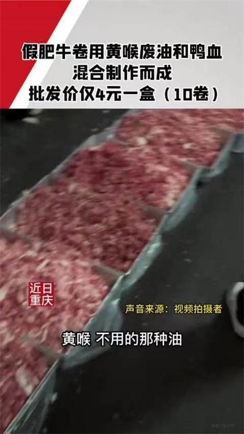 重慶男子最近發(fā)現(xiàn)一個(gè)令人非常震驚的真相,偶然的機(jī)會(huì),在肥牛卷作坊看到了非常令人惡心的制作過(guò)程。在作坊當(dāng)中,工作人員會(huì)將黃喉廢油以及鴨血通過(guò)機(jī)器融合在一起,制作出假的肥牛卷,裝在盒子里面。工作人員告訴男子成本為4元每盒,在市面上的出售價(jià)格為10元每盒。看到這個(gè)視頻之后,有大多數(shù)網(wǎng)友表示:以后再也不會(huì)選擇購(gòu)買(mǎi)零售店的肥牛卷了。