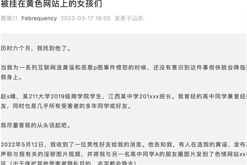 被造謠的女生公開發文表示,這名男大學生趙某峰曾經是自己的高中同學,他將自己在朋友圈發的照片PS之后發布在黃色網站上,不久之后她收到一位男性好友的消息,告知她有人在造她的黃謠,還發布了和她有關的淫穢圖片和視頻,據悉受害人不止一名女生,事后受害人已經報警,3月9日她接到了派出所打來的電話,告知趙某峰因犯傳播淫穢物品罪被判定拘留10天,并且將在暑假期間執行。