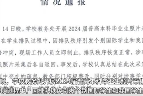 近日廣西醫(yī)科大學“國際學生和中國學生發(fā)生沖突”事件引發(fā)了社會諸多關注,3月18日下午廣西醫(yī)科大學官方微博對于此次時間發(fā)布了情況通報。事發(fā)于3月14日晚,當時學校的教務處正在開展2024屆普高本科畢業(yè)生照片采集的工作,在學生排隊的時候因為秩序引發(fā)了國際學生和中國學生之間的言語沖突,現(xiàn)場工作人員發(fā)現(xiàn)情況后第一時間進行制止,隨后排隊秩序也恢復正常,涉事的學生在完成采集照片之后已經(jīng)各自返回。