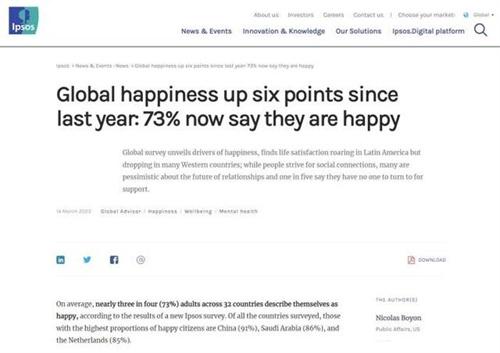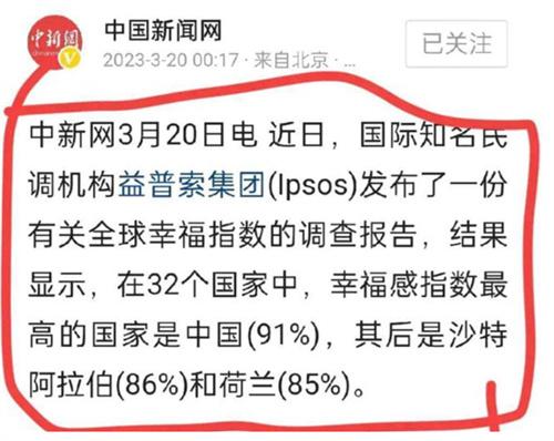 最近國際的知名調查機構益普索集團發布了一則關于全球幸福感指數的報告,在報告當中顯示參與調查的32個國家幸福感指數最高的國家是中國,達到了91%,其次是沙特阿拉伯達到了86%,和荷蘭國家達到了85%,益普索是一家總部位于法國巴黎的全球知名民調機構。