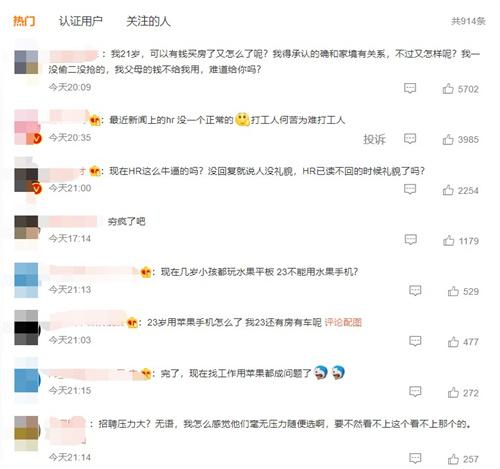 對于使用蘋果手機這一理由來說,絕大網友是不認可的,甚至有網友稱23歲有人還能開得起保時捷呢。甚至有網友調侃,到現在找工作使用蘋果手機都成了一種問題,都是打工人,何必互相為難,蘋果手機的價格也不是極高的,除了普通的機型在1000以下,安卓和蘋果基本價位都差不多了。