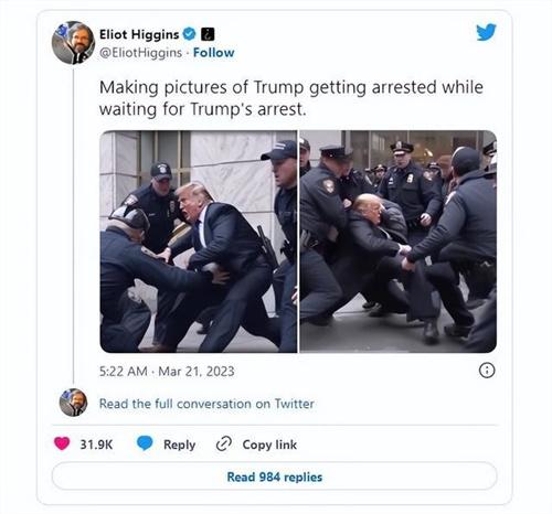 這一部分圖片都是人工智能最終合成制作的,其中的有幾幅圖片,是作為調(diào)查機(jī)構(gòu)的創(chuàng)始人Bellingcat以及創(chuàng)意總監(jiān)艾略特-希金斯創(chuàng)作出來(lái)的,艾略特說(shuō)到自身通過(guò)AI的工具M(jìn)idjourney,將這些圖片做出的合成,這一工具通過(guò)比較簡(jiǎn)單的文本提示,就可以生成需要的道具,而艾洛特對(duì)圖片的關(guān)鍵詞啟用的是:特朗普被捕時(shí)摔倒,新聞鏡頭。