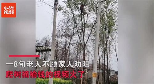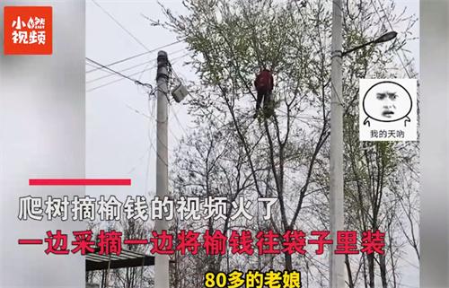 從現場所拍攝的視頻來看,一位80歲的老人正扛著一個袋子依靠在榆錢樹上,這棵榆錢樹看起來瘦高瘦高的,目測應該有一二十米,從樹底到有樹枝所在的地方,應該有好幾米高的位置,老人是爬到了樓梯的頂端,才能夠勉強抓住樹枝,后續是沿著樹枝開始去采摘樹上的榆錢,一邊采摘榆錢,一邊腿腳利索的向更上端的樹枝上去攀爬,由于樹枝比較細,小老人在攀爬的時候整棵樹都在搖晃,不免讓人看的心驚肉跳。
