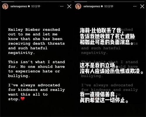 賽琳娜幫助所以海麗發布的這則聲明已經是賽琳娜第二次進行發聲,塞琳娜在文中表示海莉和賈斯汀bible聯系到了,我告訴他海莉受到了死亡威脅和負面消息。這并不是他自己的立場,沒有人喜歡仇恨和欺凌,他一直都希望廣大網友一定要善良,并且停止這一切的事件,在此前海麗并沒有覺得自己收到的那些威脅言論是塞琳娜的粉絲所作所為,同時他也認為賽琳娜不需要為自己發言,因為不是他的事情,在網絡,上海麗還呼吁大家停止網絡暴力,倡導愛與和平。