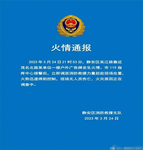 上海靜安消防在3月24日晚上就已經(jīng)發(fā)布火情通報(bào),其內(nèi)容顯示2023年3月24日21:53由靜安區(qū)吳江路靠近茂名北路一家單位樓,戶外的廣告牌發(fā)生大火,在119指揮中心接到報(bào)警之后,立即向該地方派出消防救援力量,趕緊趕往現(xiàn)場(chǎng)進(jìn)行布置,大火得到有效的控制,現(xiàn)場(chǎng)確定無(wú)人員傷亡,目前正在調(diào)查火災(zāi)的原因。