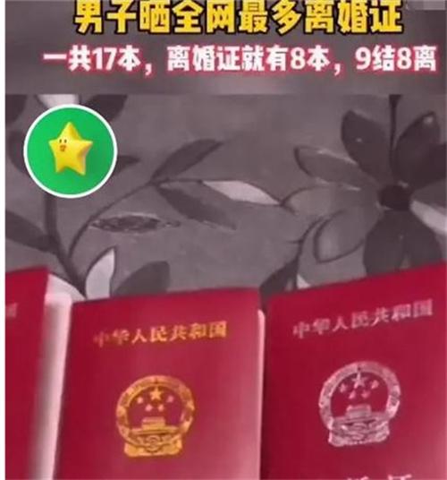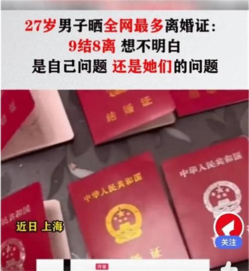 近日在我國的上海地區(qū),一名27歲的男子曬出了自己的一堆結(jié)婚證和離婚證,讓許多的網(wǎng)友表示非常的震驚,而該男子則表示自己的每一張結(jié)婚證和離婚證全部都是真實(shí)的,而且全部都是由民政局頒發(fā)的。他也表示不知道自己離婚到底是什么原因,也想不明白究竟是自己的問題造成的離婚,還是他們的問題造成的離婚。有網(wǎng)友在評(píng)論當(dāng)中表示該男子可以成為民政局的VIP客戶了,當(dāng)然,這句話是用來調(diào)侃他的。