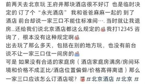 對于這類事件網友也是十分的氣憤,于是撥打了北京地區的12345進行核實,但12345的工作人員答復網友聲稱并沒有這樣的無效規定,網友告訴大家,自己以前在很多地方都玩耍過,但從來沒有遇到過這種情況,這讓他非常的難受。網友也詢問了酒店的工作人員,如果一家三口要入住的話,需要訂購什么類型的酒店。有從事酒店行業的網友聲稱,如果該酒店限制了標準房的入住人數,應該進行規定的,派出所的上傳系統雙人間里面只能夠登記兩人。如果在一間房間當中超出了兩名成年人的話,工作人員是無法將信息錄入到公安系統,如果出現了特殊行為,酒店的工作人員也要付出責任。