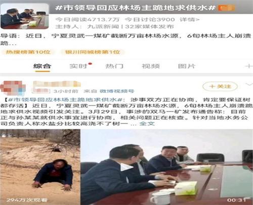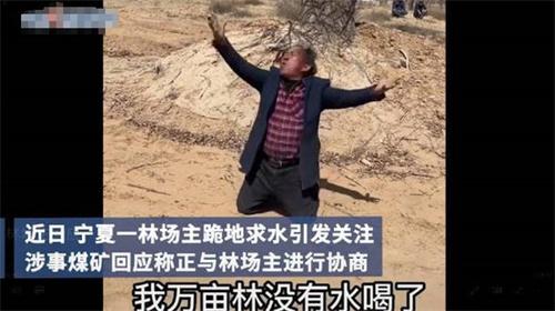 3月28日網絡上的一則視頻引發了廣泛的關注,視頻中一名男子跪在地上崩潰哭喊自己的萬畝林場沒有水喝。據視頻中的這名男子孫先生表示,在寧夏靈武市馬家灘鎮承包了這萬畝的荒沙灘是從2003年開始的,在這里進行植樹治沙。但是當地的雙馬煤礦,將林場的水源破壞了。煤礦曾經給過承諾會在3月27日供水,但是沒能夠兌現,這一情況導致孫先生崩潰大哭。