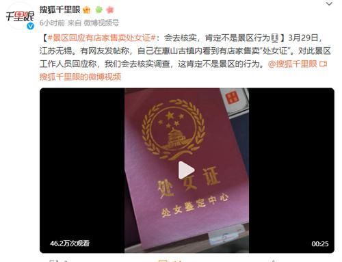 一名網(wǎng)友于3月28日在網(wǎng)絡(luò)上發(fā)帖稱在惠山古鎮(zhèn)景區(qū)的一個商店里發(fā)現(xiàn)有出售處女證。發(fā)帖人是一位姓王的女士,表示當時在景區(qū)里四處逛的時候,發(fā)現(xiàn)一家商店的櫥窗里售賣處女照,但是當時不敢與商家進行對峙,就選擇了拍攝照片發(fā)到社交平臺上,并沒有想到因此會引來廣泛的關(guān)注。