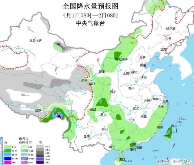 明天開始,大范圍雨雪將鋪展開來,內蒙古河套地區、西藏東部、西北地區東部、華北南部和西部、黃淮西部、江漢、江南北部、西南地區東北部等地部分地區有中到大雨,其中,河南南部、湖北北部和南部、湖南北部等地部分地區有暴雨或大暴雨。預計本輪雨雪天氣過程主要出現時段在4月2日至4日。