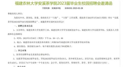 記者在調(diào)查的時(shí)候發(fā)現(xiàn),福建農(nóng)林大學(xué)安溪茶學(xué)院的招聘會(huì)是在3月30日下午開始的,這一次的招聘會(huì)是由福建農(nóng)林大學(xué)黨委學(xué)工部,福建農(nóng)林大學(xué)學(xué)生創(chuàng)新創(chuàng)業(yè)中心以及安溪縣人力資源和社會(huì)保障局聯(lián)合舉辦的,學(xué)校的官網(wǎng)在2月28日就已經(jīng)發(fā)出了此次招聘會(huì)的邀請(qǐng)函,據(jù)邀請(qǐng)函當(dāng)中顯示,招聘單位需要將招聘簡(jiǎn)章,崗位,所需專業(yè)和工資待遇發(fā)給學(xué)校,經(jīng)過學(xué)校審核之后,招聘企業(yè)才能夠正常入場(chǎng)。
