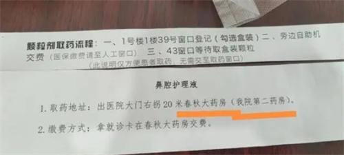 針對此次網(wǎng)友所爆料的事件,記者來到了鄭州市金水區(qū)的河南中醫(yī)藥大學(xué)第一附屬醫(yī)院,果然如先前網(wǎng)友所宣稱的那樣,一名姓郭的主醫(yī)師開具了兩個藥單,一個藥單是提醒到該醫(yī)院一號樓一樓位置登記領(lǐng)藥,另外一個要單則是開具一個鼻腔護理液,拿藥的位置是出醫(yī)院右拐20米的春秋大藥房,繳費的方式是使用醫(yī)院就診卡在春秋大藥房繳費。