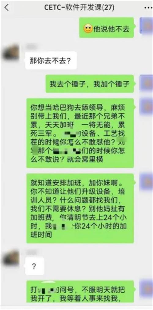 4月4日,在網(wǎng)絡(luò)上流傳出很多張聊天截圖,顯示的是兩個(gè)微信工作群內(nèi)的聊天記錄,在群內(nèi)有領(lǐng)導(dǎo)表示清明節(jié)需要加班,但沒有員工主動(dòng)請(qǐng)纓,隨后領(lǐng)導(dǎo)指定了兩個(gè)人,被指定的員工陳某某在群中明確表示不想加班,并將之前一直加班的怨氣爆發(fā)出來(lái),甚至怒懟多名領(lǐng)導(dǎo),引發(fā)了部門其他同事的共鳴,也導(dǎo)致公司內(nèi)很多員工都表示要辭職。