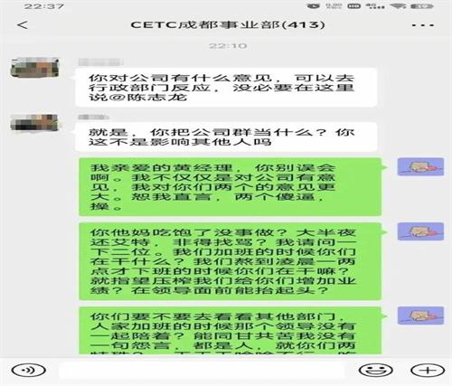 最近,員工因?yàn)楸粡?qiáng)制加班怒懟領(lǐng)導(dǎo)的事件引發(fā)了網(wǎng)友的廣泛關(guān)注和討論,記者從知情人士處獲得最新消息,怒懟領(lǐng)導(dǎo)的當(dāng)事人陳某某是四川德陽(yáng)經(jīng)開區(qū)某科技公司的員工,網(wǎng)傳中國(guó)電科員工的身份不符,并且怒懟領(lǐng)導(dǎo)的聊天記錄儀式是偽造的。盡管中國(guó)電科在第一時(shí)間否認(rèn)了陳某某是中國(guó)電科的員工,但現(xiàn)在輿論仍然在網(wǎng)絡(luò)上持續(xù)發(fā)酵,這件事還在進(jìn)一步調(diào)查中,并沒有披露出更多的信息。
