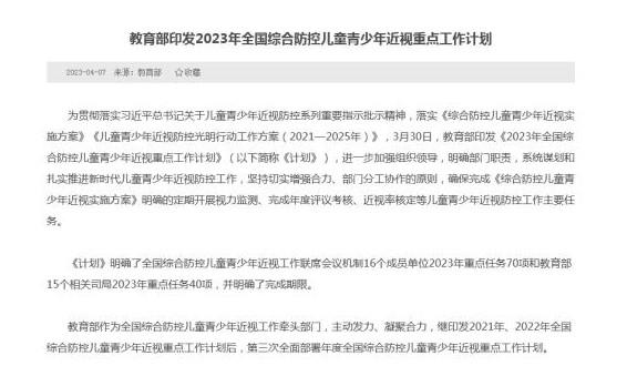 北京時間4月7號教育部也重新印發了關于《2023年全國綜合防控兒童青少年近視重點工作計劃》,根據這個計劃將會全面部署2023年關于近視防控的工作計劃。在這份重新印發的工作計劃中明確指出,地方教育的行政部門一定要確保以及監督落實學生關于體檢制度,包括每一個學期學生的視力監測制度,一定要把學生的監測結果進入到兒童青少年視力健康檔案中,按照相關規定上報全國所有學生體質健康系統。
