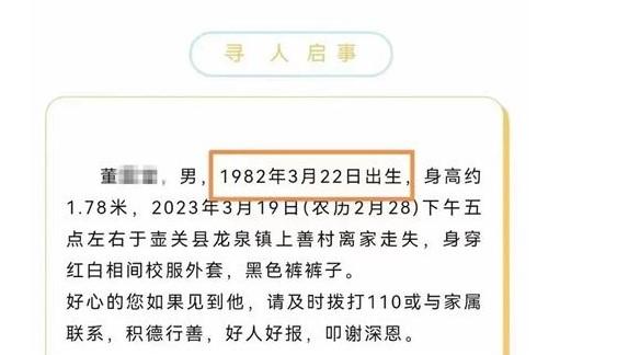 近日關于一則尋人啟事的發布內容也引起了網友的關注。北京時間3月27號在一個“微壺關”的微信公眾號中就發布了一篇尋人啟事,文章的標題是《壺關一名老人走失,希望大家幫忙尋找》,在這篇尋人啟事中稱董某某是1982年3月出生北京時間3月19號的時候,在壺關縣龍泉鎮上善村離家出走,在尋人啟事中也顯示出董某某患有先天性的精神疾病,希望熱心人士在發現線索的時候,能夠及時和家人聯系,上面還標注了家人的電話號碼。或者是直接撥打110。也詳細地描述了董某某在離家出走時身穿的衣服樣式包括顏色。