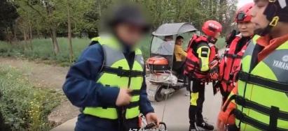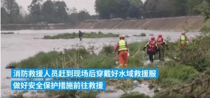 只見有兩名消防人員攜帶著救援工具小心的趟過水,慢慢地向被困在河中心的男子靠攏,給他穿上救生衣。通過隊友之間的配合,以及在岸邊對有的合作下,經過15分鐘,屠先生終于被消防人員攙扶到淺水區域成功上岸。