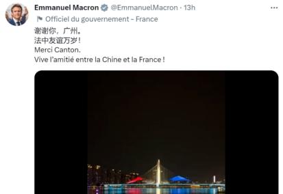 環球網在4月8號報道法國總統馬克龍在北京時間4月5號到北京時間4月7號,這幾天將會對中國進行國事訪問結束訪華行程之后,在北京時間8號零點左右,法國總統馬克龍也在結束訪華行程之后在自己的社交媒體賬號推特上,用三種語言分別發表了一段文字,分別是謝謝你廣州,法中友誼萬歲,同時還表達了對廣州的感謝,在這一篇推特文章中馬克龍還加入了一個視頻,是廣州獵德大橋的燈光秀,能夠在這段視頻中可以看到中法兩國國家的國籍,包括和平鴿飛起的畫面。
