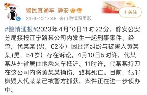 上海市公安局靜安分局于發(fā)布警情通報超江寧路某公司發(fā)生刑事案件。一名男子代某某與黃某某產(chǎn)生經(jīng)濟糾紛,于4月10日5:00左右乘車抵達上海,11:00左右到達黃某某所在的公司,將黃某某捅傷導(dǎo)致黃某某死亡。警方已經(jīng)將犯罪嫌疑人代某某抓獲,案件正在進一步的進行審理和偵查。