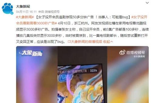 4月10號一名浙江杭州的網友就在社交平臺上發布了一個視頻,吐槽自己在家用優酷APP在電視上追劇的時候,居然出現需要觀看3000多秒廣告,折算起來將近一個小時,