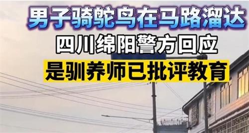 綿陽公安交警直屬五大隊經過調查發現這名騎鴕鳥的男子是一名訓練師,目前公安部門已經對這名男子進行了批評教育,并且告訴他只能在園區內進行鴕鳥的訓練,不能騎鴕鳥上路,以免鴕鳥在路上受到驚嚇發生意外。