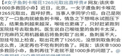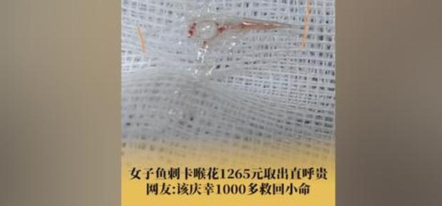 在醫生看過之后說,魚刺扎的地方過生,所以需要打麻藥,利用機器將魚刺取出來,雖然魚刺比較小,但是通過檢查和打麻藥,機器取刺等一系列操作之后加起來超過了1200元,女子感覺到十分心疼。但網友評論那雖然價格稍顯貴,但確實救了一條命,這樣想想的話與命相比這個價格也不是很貴了。