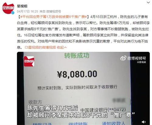 陳大哥曾被授予“余杭區見義勇為積極分子”,他的兒子被確診白血病,陳大哥在“輕松籌”上為兒子籌集救命錢,籌到1萬元卻被“輕松籌”的一名籌款顧問抽走了8000元的“推廣費”,這件事情在被媒體披露之后輕松集團做出回應,已經將這名籌款顧問開除,并保留追究其法律責任的權利。