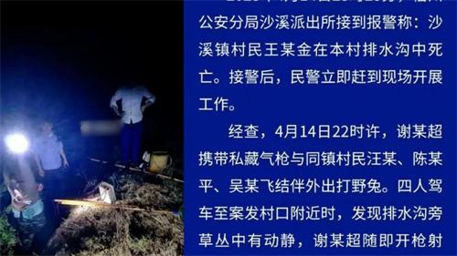 2023年4月14日晚上23點(diǎn),信州公安分局沙溪鎮(zhèn)派出所接到報(bào)警,一起關(guān)于村民王某在村中排水溝死亡的事件。據(jù)悉,該事件的整個(gè)發(fā)展情況,4月14日的晚上10點(diǎn)左右,村民謝某和同村的汪某,陳某,吳某私自攜帶氣槍外出打野兔,4人駕車來(lái)到沙溪鎮(zhèn)村口附近,發(fā)現(xiàn)排污溝有動(dòng)靜,謝某開(kāi)槍射殺,導(dǎo)致受害人王某頭部受傷,跌入排水溝死亡。隨后公安機(jī)關(guān)控制謝某等4人,并將4人依法刑事拘留,案件正在調(diào)查當(dāng)中,沙溪鎮(zhèn)下一步將會(huì)在全市范圍內(nèi)開(kāi)展整治槍擊違法事件的專項(xiàng)行動(dòng),維護(hù)社會(huì)持續(xù)穩(wěn)定。