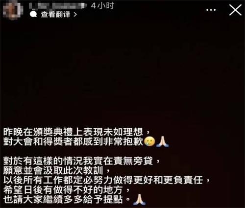 頒獎典禮當天《神探大戰》當中的韋家輝、陳偉斌和麥天樞獲得了最佳編劇獎,這個獎項由王丹妮和劉俊謙兩人頒發,據了解這兩名演員此前曾在電影《梅艷芳》當中飾演梅艷芳和張國榮,當時劉俊謙念完開幕詞,接下來由王丹妮念完剩下的獲獎人名單,到“麥天”兩個字之后就卡住,她還小聲詢問劉俊謙這個字應該怎么念,在兩人都沒有確切答案的時候,直接跳過了這個字,17日王丹妮則在社交媒體上發表文章表示對這件事情感到很遺憾,還表達了自己的歉意,并說到自己將繼續加強職業素養,力爭在今后的工作中避免此類錯誤。