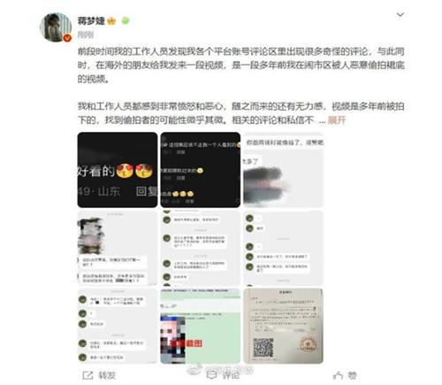 根據(jù)蔣夢婕所描述的信息來看,蔣夢婕團隊的工作人員發(fā)現(xiàn)她的社交平臺賬號評論區(qū)出現(xiàn)了很多奇怪的評論,與此同時,蔣夢婕在海外的朋友給她發(fā)來的一條多年以前曾經(jīng)在鬧市區(qū)被人惡意偷拍裙底的視頻,對于這起事件,蔣夢婕團隊和她本人都感覺到十分憤怒,不過由于該視頻是多年以前拍下來的,想要找到視頻偷拍者非常困難,不久之后她卻收到了一條私信,聲稱會將該視頻發(fā)給各大影視公司和品牌,并勒索蔣夢婕。