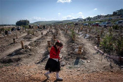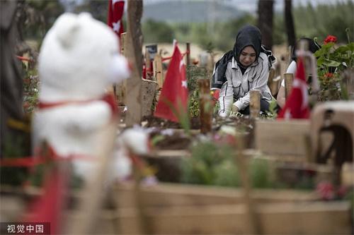 在當地時間2023年的4月23日,土耳其卡赫拉曼馬拉什城外的墓地當中,可以看到有一只泰迪熊被民眾放置在了墓碑之前,親屬們都紛紛前往墓碑前做出哀悼,這個墓地在地震之后,新增加的墓碑超過了6000座,而且依然在不斷的增加當中。