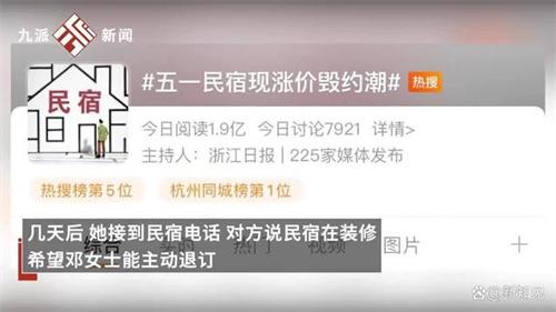 即將到來的五一小長假在近日引起高度的關注,主要是由于多個地方的民宿頻繁出現毀約的情況,給游客的理由千奇百怪,來自于杭州的鄧女士之前在平臺上預定成都一家民宿,三天晚上的價格總共345元,但是接到民宿的電話,表示正在裝修,需要對方退房間,之后鄧女士就在其他的平臺上看到同日期同款的房源價格是500多元一晚上。