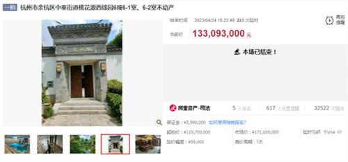 4月24日下午阿里法拍網網上杭州一套最貴的法拍房成功交易,經過228輪的競價,最終以12.7萬/平米的價格完成了交易,總價為1.33億元,這個價格比最開始評估的1.71億元也低上不少。